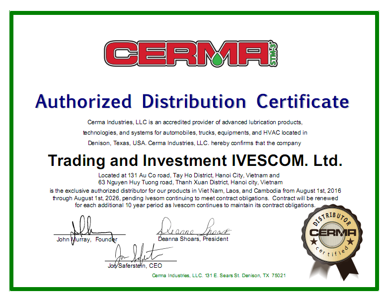 • Sau 5000 km với ôtô, 800 km với xe máy và 48 giờ với hệ điều hoà, Cerma phát huy tối đa tác dụng. Động cơ sẽ vận hành ở trạng thái ổn định và hiệu quả nhất.