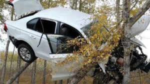 Hình ảnh chiếc ô tô nằm lơ lửng trên ngọn cây và bị hỏng cả...